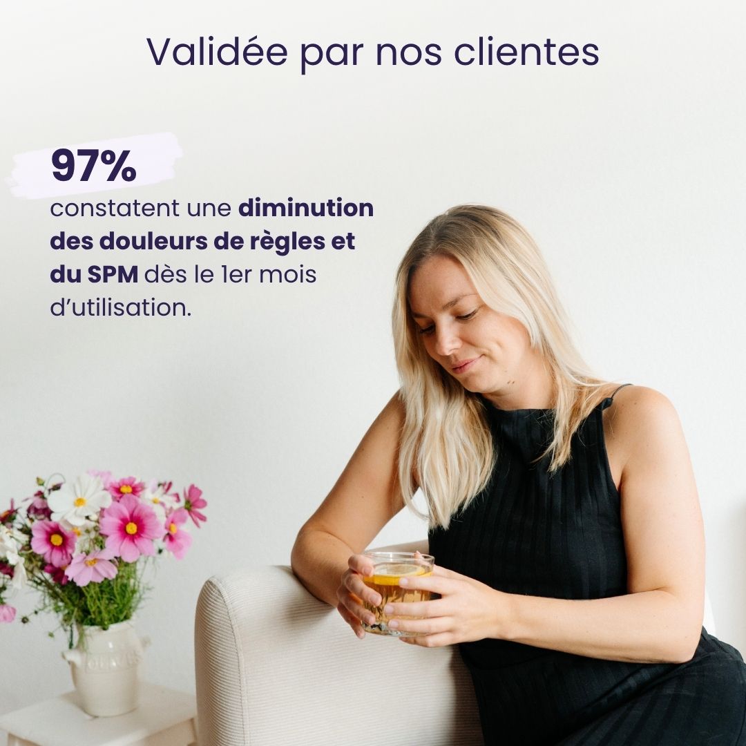 💜 Les premiers effets peuvent se faire sentir dès le 1er cycle : réduction des douleurs, humeur plus stable, ventre plus léger.